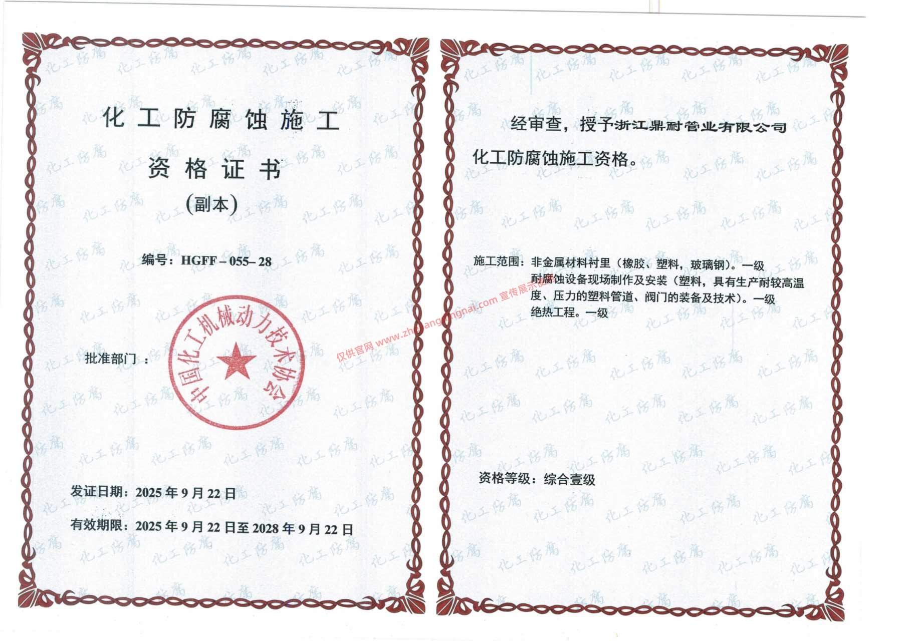 化工防腐蚀施工资格证书 | 浙江鼎耐塑胶管阀有限公司官网